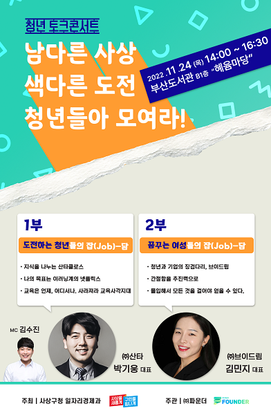 사상구가 주최하고 ㈜파운더가 주관하는 ‘청년 토크 콘서트’는 관내 청년 약 60명을 대상으로, 오는 11월 24일 오후 2시부터 오후 4시 30분까지 진행될 예정이다.